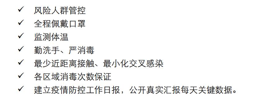 为了及时有效应对疫情,我们建立了防疫领导工作应急小组、防控疫情工作日报、每日消毒打卡机制、分批就餐等。